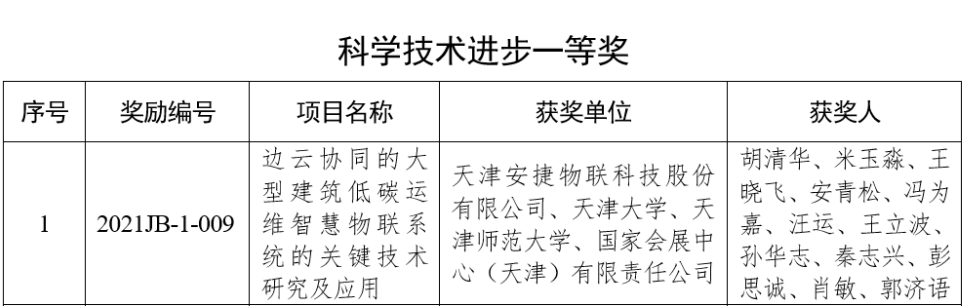 日前,2021年天津市科学技术奖获奖名单公布,由天津3003.com新葡的京集团物联科技股份有限公司联合天津大学、天津师范大学、国家会展中心(天津)有限责任公司申报的《边云协同的大型建筑低碳运维智慧物联系统的关键技术研究及应用》项目,荣获“天津市科学技术进步一等奖”。